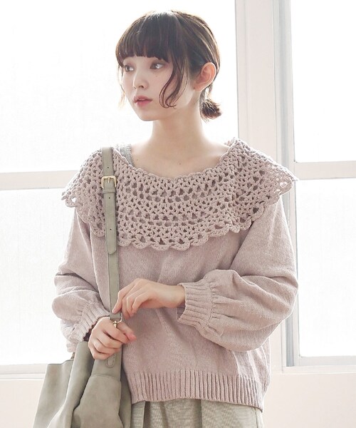 大きなラウンドカラーが目を惹くニット。 ざっくりとしたレースのようなかぎ編みデザインが女の子らしい雰囲気。 存在感がありながらも身頃はシンプルなのでデイリーにも合せやすいアイテム。 アイボリー、パープルの2カラー。