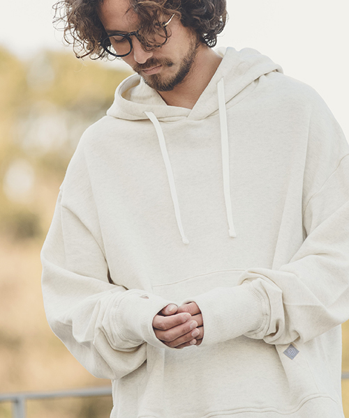 181cm 66kgのモデルがMサイズを着用柔らかな肌に馴染むよう上質なコットン素材を使用した シンプルなデザインだからこその着こなしを楽しめる魅力あふれる1枚。ゆったりめのサイジングで、フロントに重なりを入れた2重のフードデザインでより立体感のあるフォルムなど細部へのこだわりを感じさせてくれます。長めの袖口部分に配された指ぬきがアクセントになり1枚で着ても納得のシルエットを形成します。 ※着用画像と商品単体画像で色が異なる場合がございます。※商品単体画像を実物により近づけております。
