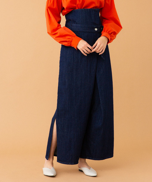 ■素材洗いをかけると表面感が特徴的なデニム生地を使用。ストーンウォッシュでカジュアルな表面感のブルーと、ワンウォッシュできれい目にはけるネイビー。■デザインモード×和テイスト×今っぽさの調和。はかまのようなラップ風パンツのデザインは、シーズンレスで着用いただけます。ハイウエストのアシンメトリーデザインと、裾のスリットが今年らしいゆるさを演出します。ウエストのベルトは取り外しも可能です。コンパクトなトップス にあわせてシンプルに、今年らしくレースや透け感のあるのトップスに合わせて頂くのもオススメです。