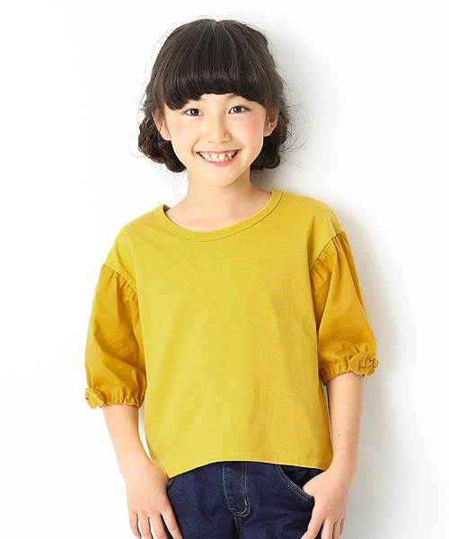涼しげな印象の、『袖口リボン7分袖Tシャツ』。身頃と袖の生地を変えることで、夏まで着れる涼しげなTシャツに仕上げました。袖口にちょこんとついたリボンが女の子らしい印象を与えてくれます。前身頃の着丈を短くすることでINしやすく、ハイウエストのボトムスとも相性抜群◎綿100%だから肌触り・通気性の良いさらっとした着心地で汗の吸収・発散性に優れており型崩れしにくいのもポイント。キッズからジュニアまでをカバーする100cm~160cmまでの豊富なサイズ展開になっています。■ディティール■伸縮性:あり・首周りは伸びにくい縫製・便利なお名前タグ付き