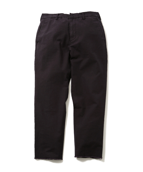 洗い加工の入ったリップストップ素材のチノタイプパンツ。色味の落ち感などが特徴。ローファーと合わせ春らしい爽やかなスタイルに最適。 model:身長173cm 着用サイズ:32