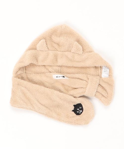 フード付きのマフラー。かぶるとにゃーの耳がついております。肌触りの良い素材なのも嬉しいポイント。温かみのあるブラウン、使いやすいブラックの2色展開です