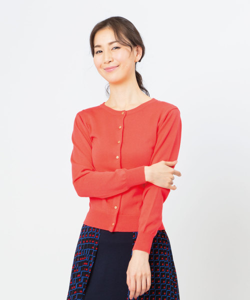 2019SS シーンを問わずに活躍する万能カーディガン。 【デザイン】 1枚で旬な着こなしを叶えてくれるカーディガン。クルーネックのベーシックなデザインに、後ろ身頃をリブで切り替えたデザインがポイントです。リブは編地を変えイレギュラーにすることで表情豊かな仕上がりに。立体感の出るリブデザインがシンプルなスタイリングに表情を与えてくれます。コンパクトな着丈で、しなやかにフィットするサイズ感が女性らしい1枚です。フロントのメタリックなボタンが上品さをプラス。 【素材】 伸縮性のある柔らかな肌触りと軽やかさのあるコットンレーヨン素材を使用。着ていくうちに肌に馴染んでいく着心地の良さが魅力。ご家庭で手洗いできるのも嬉しいポイントです。 【スタイリング】 一枚あると便利なカーディガンはオンオフ問わず、幅広いシーンに活躍します。パンツからスカートスタイル、ワンピースなどとの相性も良く、合わせるアイテムに困らない万能な一枚。 同素材のイレリブニットと合わせたアンサンブルスタイルもおすすめです。 イレリブニット 品番:05541422