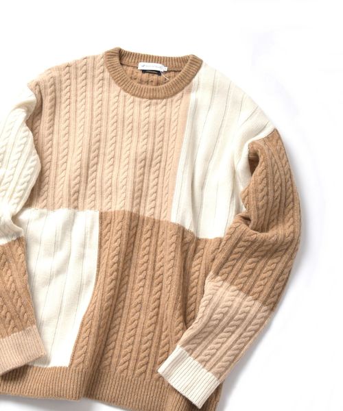 ◆ご好評いただいていた人気ジャカードニットの新色追加!◆ カシミヤをブレンドした、暖かく、さわり心地の良い一枚。 縫製では無く、ゴロつきの少ないインターシャでパッチワーク風の配色にしているので、ストレスなく着ていただけます! また、前身頃は配色の他に組織も変えており表情豊かなデザインで存在感抜群! メイントップスではもちろん、コートやジャケットのインナーとしても大活躍でこれからの季節にオススメです! ※袖部分の縫い目は異なるカラーでの縫製となっております。 予めご了承ください。 ※画像の商品はサンプルです。 実際の商品と仕様、加工、サイズが若干異なる場合がございます。 予めご了承下さい。