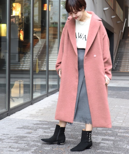 モヘアならではの上質なスモーキーピンクのシャギーコート。身体を包み込むシルエットは女性をより華奢に見せてくれます。大きめなアームホールはインナーに厚手のニットを着ても動きやすい仕様。丈はふくらはぎくらいまでと長いですが、明るい色合いなので重さを見えなくなっています。モヘアならではの上質な風合いと暖かさが有り、ボリューム感がありながら、軽さもあるオススメの一枚。※店頭及び屋外での撮影画像は、光の当たり具合で色味が違って見える場合があります。商品の色味はスタジオ撮影の画像をご参照ください。