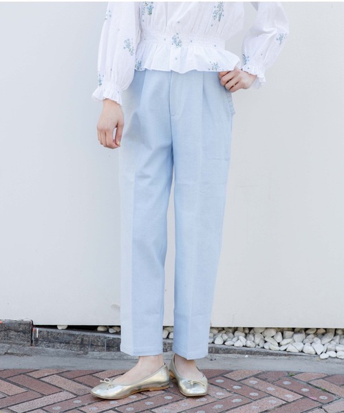春夏に使いやすいカジュアル素材のキレイ見えが叶う優秀パンツ☆ 少し細身のテーパードシルエットにセンタープレスをほどこすことで、着用した際に立体感が出て美脚効果抜群◎ サイドのポケットにあしらった小さめのタックフリルが他にはないflowerらしいポイントです! かっちりとした雰囲気になり過ぎず、コーディネートに程よいガーリーさをプラスしてくれます。 使い勝手の良い素材感ながらカジュアルになりすぎないので、Tシャツやサーマルなどリラックス感のあるアイテムとのスタイリングも女性らしく決まります。 ※ホワイトのみショート丈の裏地付きです。