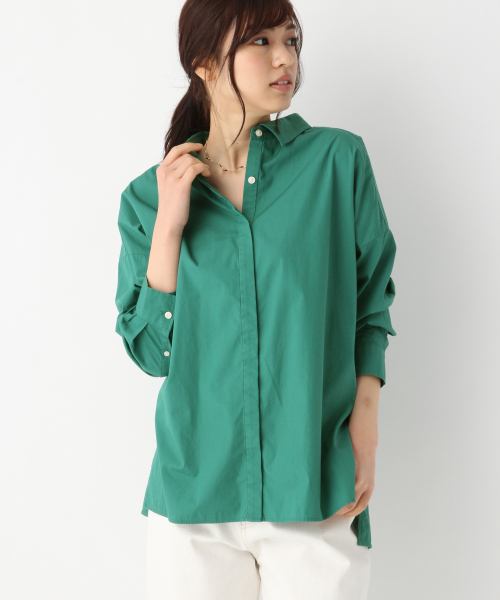 きちんとしたシーンにも!着回し万能シャツ ニットのインにしてももたつかないように、すこしすっきりとしたタイプのBIGシャツ。 スクエアなラインの裾にデザインし、スレキで縫い代を始末してありますので 裾はボトムから出して着ていただいてもコーディネートのアクセントになります。 比翼仕立てにしたことできちんとしたシーンにも対応できるシャツになっています。 ニットインや羽織り、一枚着でも通年お使いいただける万能アイテムです!