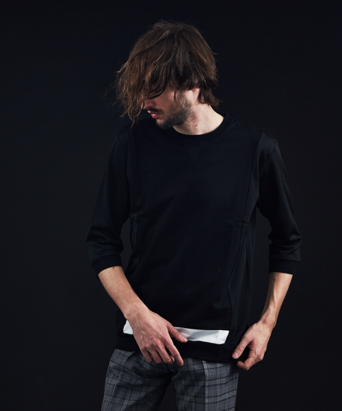 2種類の異なる裏毛素材を使用【MATERIAL】表地はナイロンとコットンの混合素材を使用したストレッチの効いた肌触りの良い生地を使用。光沢とマット、2種類の異なる裏毛を組み合わせました。光沢感のあるセミダルナイロン糸を使用した裏毛素材と、ハイゲージの編み機を使用した薄手でキレイ目な裏毛素材を組み合わせています。【DESIGN】リラックス感のあるシルエットのプルオーバー。7分袖がすっきりとした印象で、前裾の配色ラインがデザインポイントです。【COORDINATE】リラックス感のあるシルエットなので、ストライプデザインのスリムパンツやスキニーデニムなどと合わせての着こなしがオススメ。
