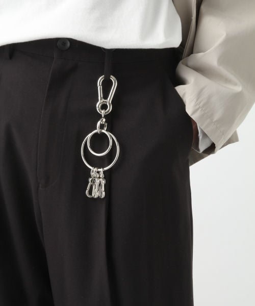 カラビナのリングキーホルダー。全体を通してミニマルなデザインに仕上げたアイテム。、リングについているカラビナは鍵をスムーズに脱着が可能で使い勝手も○。レザーアクセも程よいアクセントに最適です。腰回りに着けるだけでスタイリングの完成度が引きあがります。