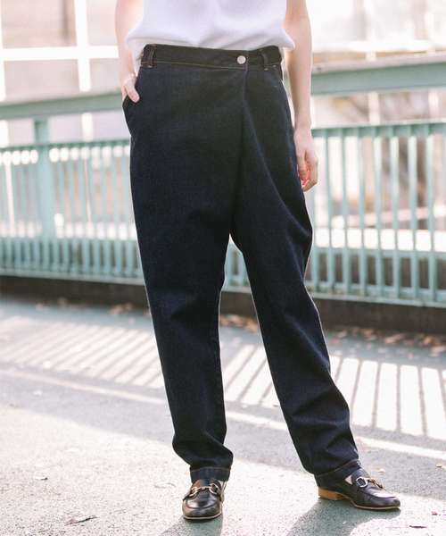 2019 SS NEW ARRIVAL ◆アシンメトリーディテールのイージーテーパードデニムパンツ◆ <MATERIAL> 10.5ozの春夏にちょうど良い肉感で、洗い上がりが非常にソフトなデニム素材です。 糸のムラが少ないフラットな目面で加工後も上品な表情に仕上がります。 ブルーは加工後にシリコン加工と柔軟加工を施してさらに柔らかく肌触りがソフトになるよう仕上げています。 ネイビーにも洗いかけ、柔らかな穿き心地が感じれる風合いに仕上げています。 <DESIGN> フロントのアシンメトリーディテールがアクセントのややリラックス感のある穿き心地のデニムパンツです。 チノパンのようなシンプルなディテールのテーパードシルエットなので、デニムのカジュアル感を少しキレイ目にアップデートしてくれます。 アシンメトリーのデザインがが気になるお腹周りをカバーしてくれ、スッキリとスタイルアップに見せてくれます。 やや腰ぎみで穿くウエストは、ハイウエストの窮屈感もなく、ストレスフリーな穿き心地を与えてくれます。 バックスタイルもヒップから裾にかけて、綺麗なテーパードシルエットなので、大人の女性に穿いて頂きたいジーンズです。 スッキリしたテーパードシルエットのデニムは、きれい目のブラウスを合わせた、カジュアルなスウェットやカットソーを合わせたり幅広いスタイリングが楽しめます。 また、ラップデティールなので、タックインした着こなしや、短めのトップスと合わせるのもおすすめです。 <COLOR> ■ブルー:ナチュラルな色落ちのブルー。わりとどんなスタイリングにも合わせやすいカラーです。 メンズライクなコーデがお好きな方におすすめのカラーです。 ■ネイビー:きれいめな印象のネイビー。デニムパンツでのきちんと感のあるカラーです。 洗いをかけていくうちにだんだんと色落ちしていく経過を楽しみたい方にもおすすめです。 <SIZE> ■普通体型157cmのスタッフはXSサイズを着用しています。 ■普通体型160cmのスタッフはSサイズを着用しています。 ■165cm以上でもやせ形の方はSサイズで問題なく着れますが、骨盤がはっていたり、長めの丈感がお好みの方はMサイズをおすすめします。 ※ウエスト、は3cmずつ大きくなり丈は2cmずつ長くなります。(多少誤差はあります) ロ若干おとして腰で穿くパンツなので、ウエスト設定は大きめです。 ※インディゴデニムについて※ インディゴ染料を使用した素材を使用しています。 染色の特性上、新しいうちは特に色落ちしやすく、他のものと擦れ合うと色移りします。 新しいうちは白や淡い色の服・バッグ・ベルト・椅子など身の回りの品への色移りにご注意下さい。 その他、お取扱い上の注意をよくご確認の上、ご使用をお願いします。 *お取扱いについては、商品についております品質表示にてご確認ください。 洗濯:洗濯機使用可 .............................≪INFORMATION ≫............................ ▼商品のお気に入り登録▼ 『♡』マークを押してお気に入り登録して頂いた商品は、セール開催の通知やクーポン発行などの キャンペーンなど、お得な情報をいち早く受けとる事が出来ますので、ぜひご登録ください。