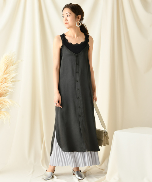 着回しが抜群のサテンキャミワンピース。 上品な光沢のあるサテン素材を使用しました。 ストラップ部分はアジャスター調整できるようになっているので、インナーやコーディネートに合わせて好みの長さで楽しんで頂けます。 両サイドには深めのスリットが施され、足さばきも良く、ロングスカートやフレアボトムなどの旬のレイヤードスタイルにも相性抜群です。 デニムやレギンスなどとのレイヤードを楽しんで着ていただくのもおすすめです。 シーズンを問わず楽しめる素材感なので、インナーや羽織りアイテム次第で幅広いスタイリングに活躍します。