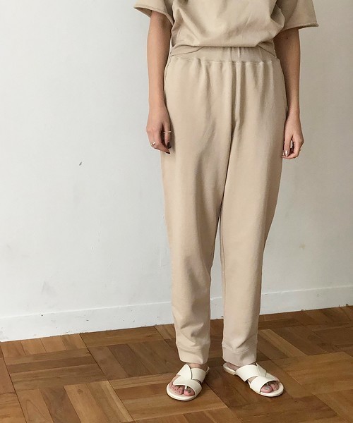 コットン100%の春夏用スウェットパンツ。ウエストはゴムで、内側に調整できる紐が付いているのでご自身のウエストのジャストサイズで穿いて頂けます。ベージュ・モカ共にtodeyfulらしいオリジナルカラーに染めているので、他にない絶妙な色味になっていてます。スウェットではあまりないこの色味がカジュアルすぎず、大人っぽく着て頂ける魅力。同じ生地を使用したトップスとセットアップで着るのもおすすめです。