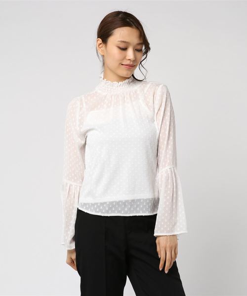 ■女性らしさを引き立てるドットブラウス■ 同系色のフロッキードットのブラウスは主張しすぎないので、柄モノと合わせても◎ シャーリングのネックとたっぷりなフレアスリーブが女性らしさを引き立ててくれるデザイン。 透け感のある素材ですが、同色のインナー付きなので安心して着て頂けます。