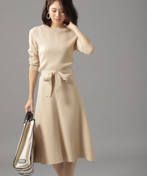トップスに透かし柄を取り入れた、品ニットワンピース。膝が隠れる着丈で、好感間違いなしのきちんとアイテムです。ボディラインを拾わないフレアラインが着やすさの秘訣。オフィスユースや、セレモニーにも活躍します。