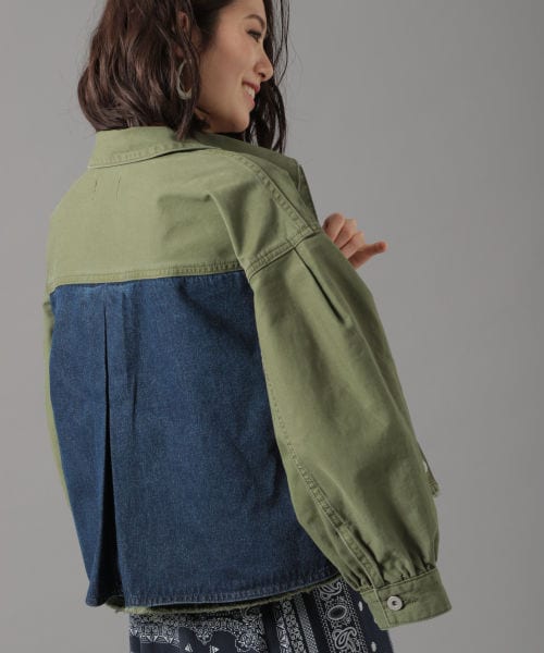 配色のパーツ使いが旬な、ボリュームGジャン。バックスタイルのタック効果で、横から見ても立体的で女性らしい印象に。衿を抜いてラフに羽織るだけで、こなれたスタイルが完成!