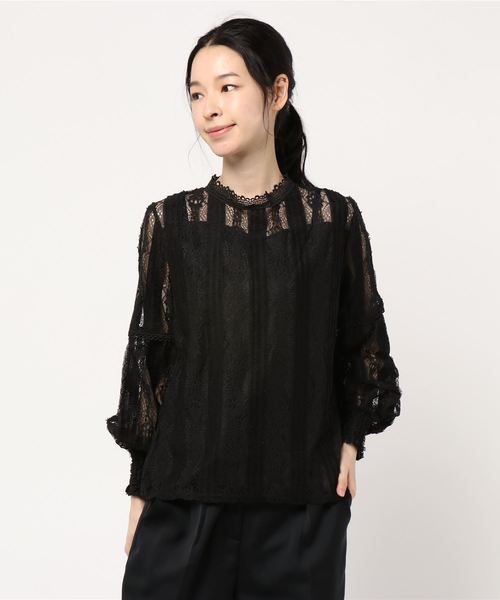 ハイネックが上品な印象を与えてくれる、華やかな総レーストップス。ボリュームスリーブの切替とシャーリングが大人レディな雰囲気。 透け感があり春夏らしい軽やかな雰囲気が魅力。 使いやすい白と黒の2カラー展開です。 【素材・サイズ感】見頃のみ裏地付きで、1枚でサラリと着られるのも嬉しいポイント。柔らかく軽やかな着心地も魅力的。バックボタンと涙あきのディティールで着脱もしやすい。 【スタイリング】レディにもカジュアルにも着まわせます。スウェットとレイヤードしてチラリと覗かせるのもおススメ。幅広いコーデで活躍する万能アイテムです。 裏地有りです。