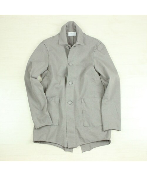 特殊な編み機で、2本の糸を同時に編み上げた張りのある度詰めの生地を使用した新型のショートコート。 カットソーながら、しっかりとした生地で形崩れしにくいのが特徴。 コンパクトなサイジングに短めの着丈で、カーディガンのように軽く羽織って着ていただけます。 シルエットはボタンを止めずに着用しても、すっきりとしたバランスに。 襟には芯地を入れることで、襟が綺麗に立つようにしたり、クルミボタンや断ち切り仕様など、細かいディテールまで凝ったつくりになっています。