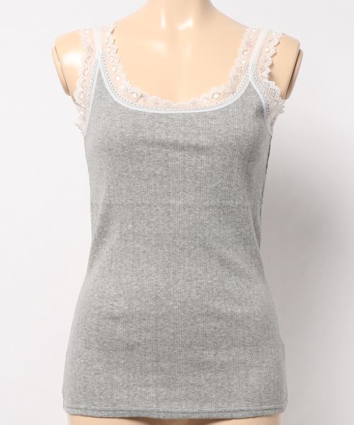 レイヤードスタイルに欠かせない♪ ネックラインにレースが施された女性らしいデザインのタンクトップ。 すっきりと程よく開いたネックに、さらに伸縮性が優れて程よいフィット感あるやわらかなアイテム。 カーディガンやシャツのインナーに使っていただけるので、重ね着のレイヤードスタイルに最適なタンクトップになっています☆