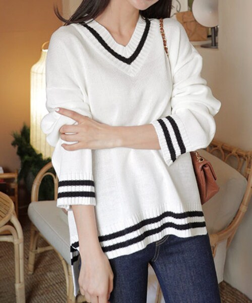 ライン配色が映えるVネックニット。 アンバランスヘムでタックインしやすいのも魅力◎お尻にかかる丈感でパンツとあわせればスタイルUP効果も期待できる一枚です。 ※WEARに記載してある金額と、DHOLIC通販サイトに記載してある金額にシステム都合上、稀に誤差が生じます。正しい金額はDHOLIC通販サイトに記載された金額です。