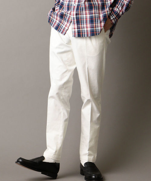 ◆クリーンな見た目なドレスチノの登場◆ 素材は穿き心地の良い綿/ポリウレタンで、縦糸にコンパクトヤーンを使用した毛羽の少ないキレイな表面感のツイルを採用! ストレッチ性がありながらも程好いハリコシによってキレイなシルエットを実現。 国内でも定評あるドレスパンツ工場で縫製し、ベルト裏には配色のダンガリー素材を使用したディテール的にも凝った一品! クリースラインは取れづらいように強めのプレスを施し、まさにドレスチノと呼べる仕上がりでビジネスカジュアルにぴったりです! model: 身長175 B83 W66 H87 着用サイズ: MEDIUM ※画像の商品はサンプルです。 実際の商品と仕様、加工、サイズが若干異なる場合がございます。 予めご了承下さい。
