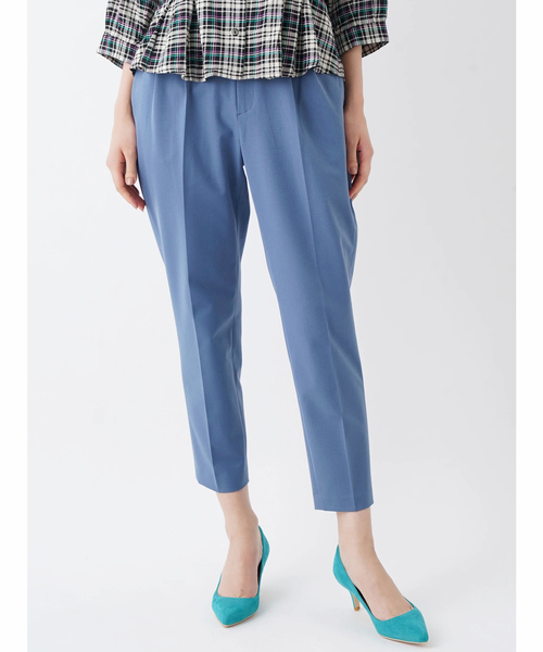 ウエストのタックとセンタープレスできれいめに仕上げたパンツ。ほどよくゆとりのあるシルエットがこなれ感を演出し、ストレッチが効いているので穿き心地も抜群です。足元をパンプスにすればオフィススタイルに、スニーカーにすれば大人カジュアルにと、着回し力が自慢の1本です。
