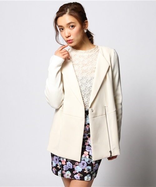 ダブルクロスジャケット フロントのダブルクロスでマニッシュに羽織れるジャケットは、テーラードなので顔周りもすっきりスマートな印象に!スリーブの異素材使いがお洒落に洗練されたデザイン。カジュアルからキレイまで幅広く対応出来る一着です。 model:H160 B82 W58 H83 着用サイズ:FREE