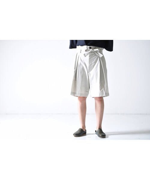 ハイウエストベルトが特徴のハーフパンツ。 フロントに施されたタックが、着用時にシルエットが綺麗に残ります。 ウエストに同素材のベルトを付属する事で、ハイウエスト風にもスタイリング可能なハーフパンツ。 同素材JK、シャツとのセットアップはもちろんの事、単体でもバランスの良いスタイリングが可能です。 超高密度コットンに日本伝統の近江晒しを採用しておりハリと光沢が生まれ、清涼感のあるパンツになっています。 股上が深く取られているので、女性のハイウエストでの着用もオススメ。 ウエスト紐でサイズ調節可能。 男女共にご着用いただけます。