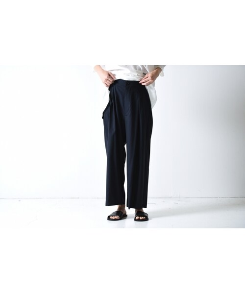 ドレープ性のあるトロピカルウールを用いて、その表情を活かすよう設計されたワイドパンツ。 裾巾を広くとったバギーよりのシルエットにすることで流れるようなドレープを表現しています。 生地は平織りのウール100% 真冬の生地ではなく、起毛感の少ない春夏秋に適した生地です。 ウール100%の表情を持った生地ですので冬場にもレギンスを挟んで頂くことで履いていただけます。 背面のみゴムの仕様。 メンズ・レディース問わずユニセックスにオススメ。