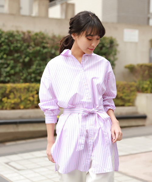前後どちらでも着られる2WAY仕様のシャツチュニック。さらに、取り外し可能なベルト付きなので、1枚で着こなしの幅が広がります。裾のカッティングも前後で違うの柄、それぞれの違った印象に。袖口にはゴムを入れており、袖をまくって手首を見せる抜け感のある着こなしがしやすいくなっています。【素材】中細糸で織り上げた、シャツ素材として1番人気のあるブロード生地を。使い勝手のいいホワイト、今年らしいブルーシャンブレーとピンクストライプの3タイプをご用意しました。【スタイリング】フロントスタイルを1:襟のつまったロールネックをフロントに、ベルトを結んでシャツブラウスとして。2:襟元のギャザーをポイントに、ベルトを外してAラインのチュニックとして。3:レギュラーカラーをフロントに、第二ボタンまで外して抜き襟で着用するBIGシャツとして。4:ボタンをすべて開けて、羽織りアイテムとして。