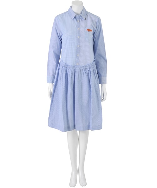 ギンガムチェックとストライプ柄が入ったデザインがポイントのシャツ・ワンピース。柔らかい薄手のコットン素材を使用しています。胸元に施されたどうぶつの刺繍がポイント。Torso:H163.5 B80 W58.5 H86 着用サイズ:02サイズ