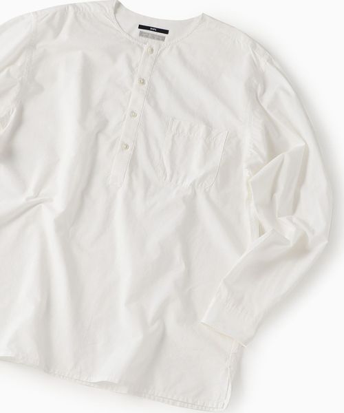 希少価値の高い素材"ペルヴィアンピマコットン"を使用した新型リラックスプルオーバーシャツ 【PERUVIAN PIMA COTTON(ペルヴィアン ピマ コットン)】 特徴は、繊維長が38-40mmと世界トップレベルの長さであること。その為、細くてしなやかな性質を持ち、高級感のある光沢を表現できます。また、天然油脂分が豊富に含まれているため、柔らかな風合いをもたらします。 ペルヴィアンピマは、年間の生産数が6000トン程度であり、全世界の綿花生産(約2600万トン)のわずか0.02~0.03%しかないため、非常に希少価値の高い綿花になります。 そのペルヴィアン ピマ コットンを使用したこのシャツは、着心地が非常に良く、上質な仕上がりとなっております。 今回、希少なペルヴィアンピマコットンを繊細なポプリンコードレーン生地に別注。柔らかな風合いと高級感のある光沢が特徴の素材に仕上げています。仕上げに製品洗いを施し、更に柔らかい風合いを高めているのがポイントです。 ◆適度なヌケ感を演出するノーカラーのプルオーバーデザイン リラックス感のあるノーカラーのプルオーバーデザインは、ジャケット等と合わせた際に適度なヌケ感、こなれ感を演出でき、インナーとのレイヤードや、スカーフ等との組み合わせで更に洒脱な印象に仕上がります。 暑い時期にも一枚でご着用いただける生地感に仕上げているため、長い期間ご着用いただけるのもポイント。 シルエットは少しゆったりめのパターニングにより、だらしなく見えないちょうど良い塩梅の上品な雰囲気に仕上げています。 世界に現存する超長綿の原種と言われているペルヴィアンピマコットン。古くから代々敬称された伝統的な農法を活かして大事に手摘みで収穫を行い、旧式の機械でゆっくり種子から分けられたペルヴィアンの綿花で織られた生地は、超長綿のやわらかさ、光沢感など、素材の素晴らしさがきっとわかっていただける、SHIPSが自信を持っておススメするシャツです。