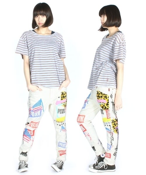 爽やかアイボリーベースにPUNK要素たっぷりなパンチの効いたステンシルプリントを載せたインパクトアイテム☆腰回りはルーズな作りで、裾にかけてタイトなスキニーラインを施したスマートなシルエットを演出してくれるパンツです♪