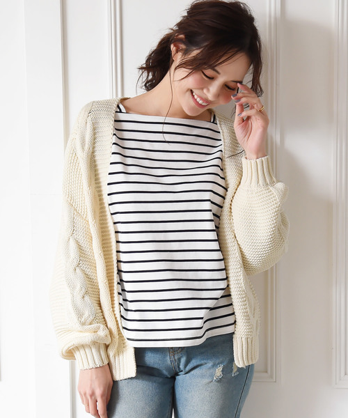 羽織るだけで雰囲気が出るざっくりニットカーデ。 全体は表面の質感がわかるパール編み、 前身頃とお袖にボリュームのあるケーブル編みが施してあります。 一見シンプルながら価値のあるデザイン。 綿混素材なので、ニット特有のチクチク感はなく 春や秋口にちょうど良いさらっとした肌触りです。 シンプルなカットソーやデニムにずるっと抜き衿で 合わせるだけでトレンド感がアップする1枚です。 *撮影場所やイメージにより実際の商品と色味が若干異なる場合がございます。商品のお色味はカラーバリエーション画像をご参照ください。