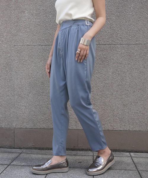 ロングシーズン活躍するテーパードパンツ ウエストサイド部分にベルトを設置し、タックを入れることで腰回りをすっきり魅せます。柔らかい素材とウエストベルトの幅を少し 太めに設定し、履き心地にもこだわりました。 ウエストはゴムとベルトを使用しているので サイズ調節可能です。 ・裏地付きで透けない
