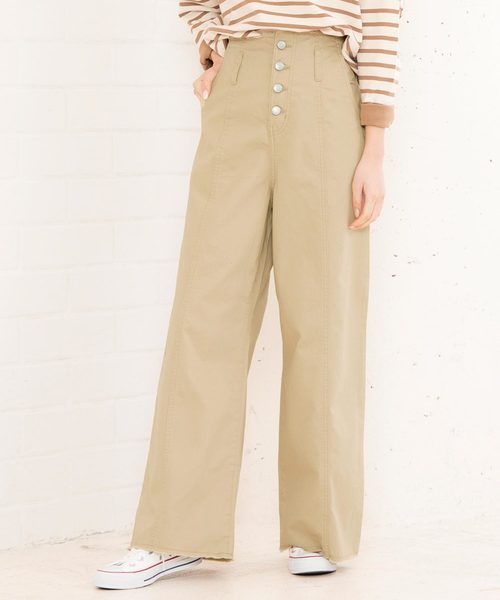 フロントボタンが目を惹くワイドパンツ。カットオフが施されこなれた印象に。ハイウエスト+センターラインのスタイルアップ効果が魅力的。 デニムとベージュチノパンの3カラー。 春夏大活躍のイチオシボトムスです。 【素材・サイズ感】綿100%素材にバックウエストゴムで窮屈感のない履き心地。ウエスト周りがすっきりと見えるデザインで、トップスインもキレイにキマります。 【スタイリング】シーズンを問わず着まわせて、カジュアルはもちろん、ブラウスなどレディなトップスとの相性も◎。シンプルなトップスをインしたボトムが主役のコーデがおすすめ。 ウエストゴム有りです。