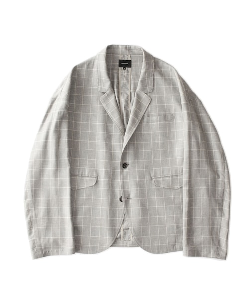 柔らかくしなやかなグレンチェック地を 使用したドロップショルダーのジャケットです。 ドレープが美しい、肌触りの良い素材と、 ゆったりとしたワイドシルエットが魅力です。 袖口を筒仕様にしており、ロールアップして シャツ感覚で着るのもオススメです。 一枚仕立てで軽く羽織ることができる テーラードジャケットです。 同素材でシャツ、パンツも展開いたしますので、 セットアップ、シャツも合わせての3Pでの着用も オススメです。 S Size : 着丈67cm 肩幅62cm バスト125cm 袖丈54cm M Size : 着丈69cm 肩幅64cm バスト130cm 袖丈55cm 組成 : レーヨン70% 再生繊維(テンセル)30% 原産国 : 日本