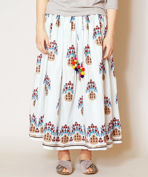 まるで花瓶・フラワーベースのような素朴な柄が可愛らしいフレアスカート。裾にはスパンコール刺繍がキラリ★*箔プリントもポイントです。カラフルなカラーがコーディネートを華やかにしてくれます。ウエスト紐には大きな『ミラーワーク』のチャームが付いています。『ミラーワーク』とはインドの伝統的なハンドワーク。小さな鏡をひとつひとつ糸でかがり、刺繍やポンポンなどで装飾したもの。魔除けとして身に着けていたそうです。・裏地付き。※こちらの商品は1点1点職人による手作りとなります。その為、生地の取り方により柄の配置や形・色合いなど若干異なる場合がございます。あらかじめご了承ください。※屋外での撮影画像は、光の当たり具合で色味・カラーが違って見える場合がございます。商品のカラーは、スタジオ撮影の画像をご参照ください。Amina Collection Co.,LTD.