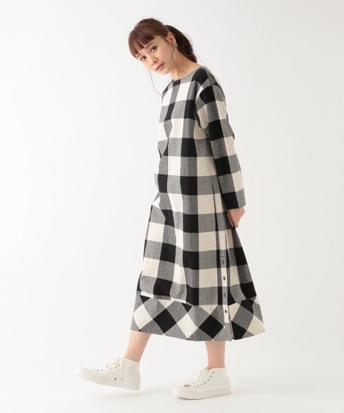 ナチュラルで適度にハリのある綿麻素材のワンピース。studio CLIPで特に人気のブロックチェック柄と、デニム風なネイビー無地のアソートカラー展開です。ゆったり目のストレートシルエットですっきりと着こなしていただけます。裾の両脇にはボタンで開閉自在のデザインを施し、ボトムスとのレイヤードスタイルなど幅広くお使いいただけます。