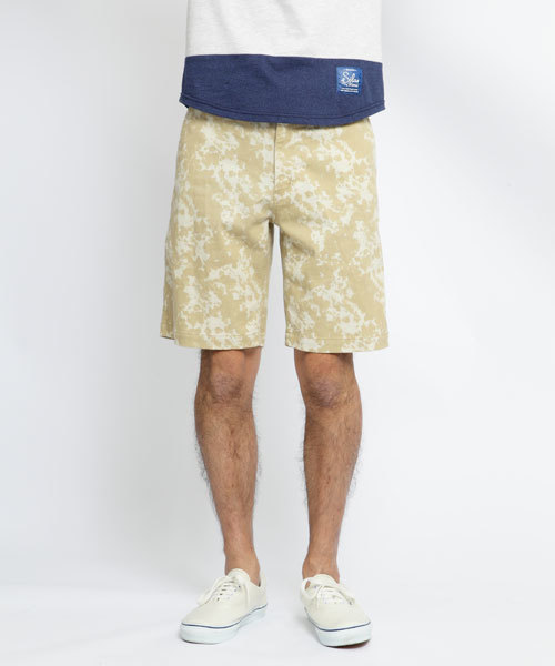 モノトーンとベージュのクラッシュ柄、サマーコールのトロピカル柄を使用した3色の柄ショートパンツ。コーディネートの主役になるインパクトある仕上がりになっている。柄感を引き立てる為にデザインはシンプルにまとめられている。 model:身長173cm 着用サイズ:32inch