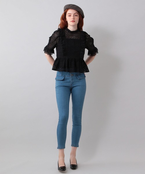 【me coutureの定番スキニーデニム】・Design Point・ハイウエストの釦デザインがポイントになったデニムスキニーパンツ。裾のミニスリットがコーディネートに抜け感をプラス。すっきりとしたシルエットで、デニムでも女性らしい着こなしに仕上がるアイテムです。・Fabric Point・ストレッチがあり履きやすいデニム素材を使用。きれい目カジュアルに使えるインディゴブルーとコーディネートの定番として使えるウォッシュブルーの2色展開です。透け感:なし裏地:なし伸縮性:あり光沢感:なし・Styling Point・シーズン問わず、フェミニンなアイテムを程良くカジュアルダウンさせてくれるので、1本あるだけで着こなしの幅が広がります。Model:H173cm B80cm W59cm H88cm S24.0cm着用サイズ:0