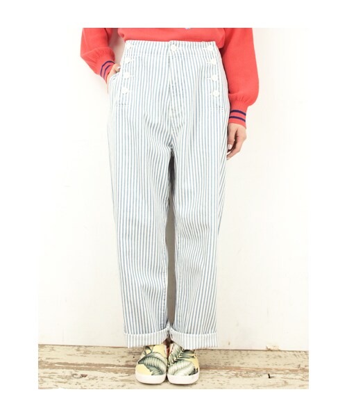 カジュアルにマリンを取り入れるならマリンパンツがおススメです。前ボタンがポイントなので、ショートトップスやINしてコーディネートのポイントに。爽やかな印象なので今すぐ着るならニットとのコーデも◎