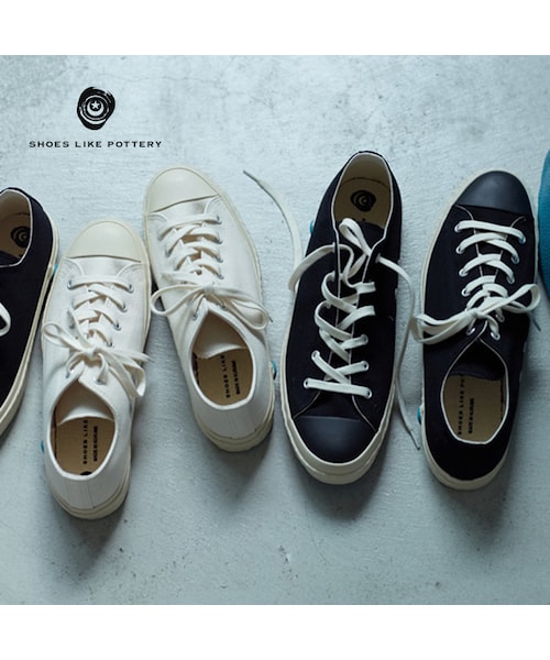 コシのあるキャンバス地を使い制作されたシンプルなスニーカー。どこか懐かしさを感じるフォルムが特徴的です。パッと目が行くのはソールに付けられた水色の丸いモノ。ヨーロッパにおいて、製造元を証明するために昔から用いられてきたシーリングワックスをモチーフにした『MOON STAR(ムーンスター)』の社印です。ソールに巻いたゴムテープの継ぎ目に施し、さり気なく『MOON STAR(ムーンスター)』社製のモノと分かる気の利いたデザインは老舗ならでは。また、ゴムテープには一つ一つ網目模様を施されています。その一つ一つ表情が異なり工業製品と言うより“クラフト”に近い暖かな表情をしています。135年以上の歴史の中でつくられた技と経験があるからこそ生まれた『SHOES LIKE POTTERY(シューズライクポタリー)』シンプルな中にも、随所にこだわりを感じるデザインが、職人達の心意気を感じさせてくれます。「ヴァルカナイズ製法」別名、加硫製法。 国内でもごく僅かの工場しか生産することの出来ない、この製法の最大の特徴は、最終工程で加硫缶と呼ばれる“窯”に入れる(ゴムの中に配合した硫黄を化学反応させる)という点です。この製法から生み出される靴には、ソールがしなやかで柔らかい、丈夫で壊れにくい、美しいシルエットを保てるといった良さがあります。そして何より、熟練の手仕事でしか生み出せない、精巧で美しい“作りの良さ”が魅力です。※一般的なスニーカーよりやや大きめの作りになっております。普段よりハーフ~ワンサイズ小さめのサイズをお勧め致します。(個人差がございますので、あくまで参考程度にお考えください。また、下記の各サイズの外寸を参考にお選びください。)