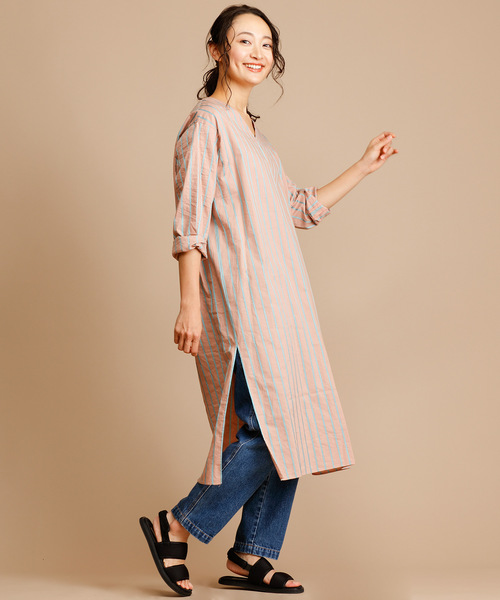 ◆コーディネート要らず、着るだけで決まるストライプシャツワンピース◆ <MATERIAL> シルク混のイタリア製ストライプで国産のものには無い繊細な風合いときれいな発色が特徴です。 各色経糸が白いシルクなのでシャンプレー組織になります。 緯糸はベースカラーのところがコットン、ラインがレーヨンなので、配色ラインには上品な光沢があります。 <DESIGN> すっきりと開いたVネックできれい見えするストライプがワンラク上の大人な女性を演出してくれるシャツワンピースです。 カジュアルな印象のシャツワンピースをシルク混の上質な素材でVネックのプルオーバーにすることで、きれいめにまとまり大人の表情をプラスしています。 顔周りをすっきり魅せてくれるVネックは、クールになりがちなシャツ素材のに色気と上品さをプラスしてくれます。 ややゆとりのある身巾にほんのりドロップした肩巾が、ほんのりビッグシルエット風でリラックス感のある着心地をお手伝い。 深めに入れているスリットからレギンスやスリムテーパードデニムなどタイトシルエットのボトムをのぞかせると引き締まります。 ワイドパンツを合わせてAラインのビッグシルエットでトレンド感いっぱいのコーデも素敵です。 ナチュラルでありながらシャツ地のパリッとした雰囲気にはバブーシュやエスパドリーユなど自然素材や雑材の小物がよくなじみます。 素材の良さがあるのでコーディネートを考えなくても着て袖をラフに折り返すだけで、程よく抜け感のあるスタイリングが完成する便利なアイテムです。 今年はリブレギンスと合わせてそのままワンピース着用してエフォートレスな印象を出しても良いですし、デニムなどパンツ合わせやスカート合わせでレイヤードを楽しむのもおすすめです。 <COLOR> ■ベージュ:薄く黄味がかったやさしいベージュ。光沢感のあるネイビーのストライプが施されています。 スタイリングしやすいカラーです。 ■ネイビー:浅い色味のネイビー。光沢感のあるレッドのストライプが施されています。 きちんと感のあるカラーです。 ■ラベンダー:紫を優しくくすませた大人カラーのラベンダー。光沢感のあるグリーンのストライプが施されています。 キャッチーなカラーで春の装いを彩ります。 ■ピンク:くすみ系のピンク。光沢感のあるターコイズブルーのストライプが施されています。 肌馴染みがよくわりといろんなカラーと合わせやすいので、色物にチャレンジしたい方にもおすすめです。 *お取扱いについては、商品についております品質表示にてご確認ください。 洗濯:手洗い可 .............................≪INFORMATION ≫............................ ▼商品のお気に入り登録▼ 『♡』マークを押してお気に入り登録して頂いた商品は、セール開催の通知やクーポン発行などの キャンペーンなど、お得な情報をいち早く受けとる事が出来ますので、ぜひご登録ください。