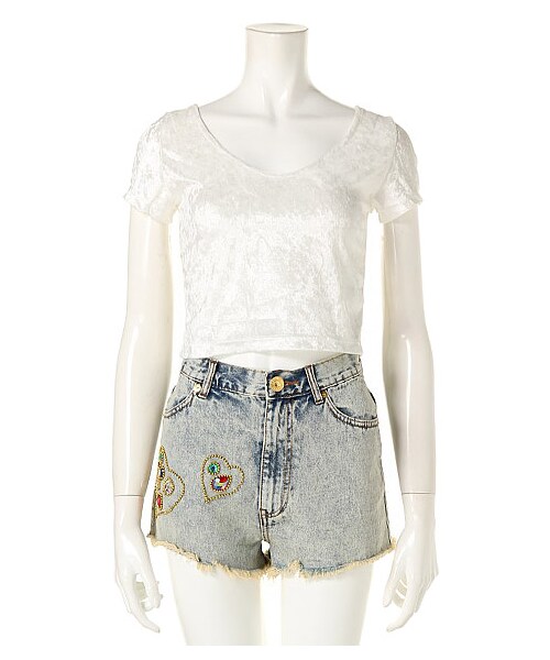 定番アイテムのTシャツを、光沢を放つベロア地でレディにアップデート★フロントだけじゃなくバックもワイドなネックや、ウエストチラ見せのショート丈が、オンナをアゲるポイント♪シンプルなシルエットだから着回し力もUP◎ハイウエストボトムを合わせれば、脚長な美スタイルもメイク!