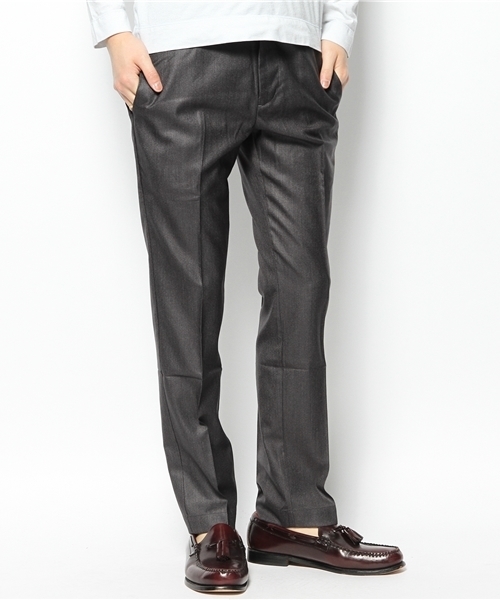 薄手のTR素材のアンクルカットスラックス。 フロントポケットから伸びたベルトデザインが、 腰回りのアクセントに効いています。 変形型のスラックスパンツなので、軽装になりがちな 春夏シーズンにコーディネートのポイントとしてオススメです。 微光沢のストライプ柄と杢グレーにチェック柄が うっすら入った2色展開です。 model:H175 B73 W71 H80 着用サイズ:SMALLチェック model:H181 B82 W73 H81 着用サイズ:SMALL 実際の商品と仕様、加工、サイズが若干異なる場合がございます。