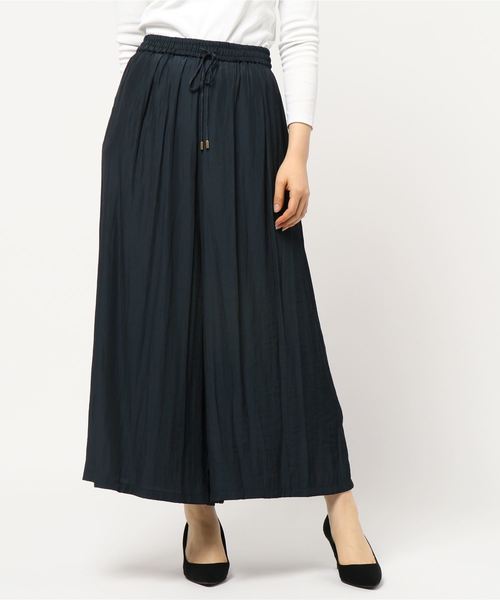 シルキーな素材にしわ加工をあしらった表情感のあるワイドパンツ。 歩くたびにふわりと揺れるエアリーな風合いが魅力で、女性らしい品のある着こなしを叶えてくれます。 ウエストはゴム仕様なのでリラックスした穿き心地で、1点投入でおしゃれ度をぐっと格上げしてくれるおすすめの1本です。