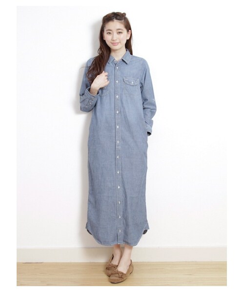 ダメージを施したシャンブレーデニムを使用したマキシシャツワンピースです。湾曲したボタン使いにすとんとすっきりしたシルエットでシンプルながらも着易いです。カラーカーデを腰に巻くなど着回しも自由自在で、長袖なのでロングシーズン使える一枚です。