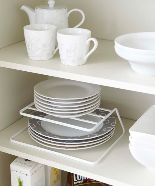 食器棚の中を有効活用できるディッシュストレージ。 2段に分けてしまうことが出来ますので、取り出しもしやすく、重ねたお皿に負担がかかりにくくなります。 食器戸棚だけでなく、キッチンのシンク上や下の棚の整理にも。 耐荷重:約1.5kg PCをすっきり収納できるラック。奥には様々なサイズのタブレットPC。手前にはリモコン、携帯電話、ペン、メガネ、DMなど、リビングまわりの小物をまとめて収納できます。