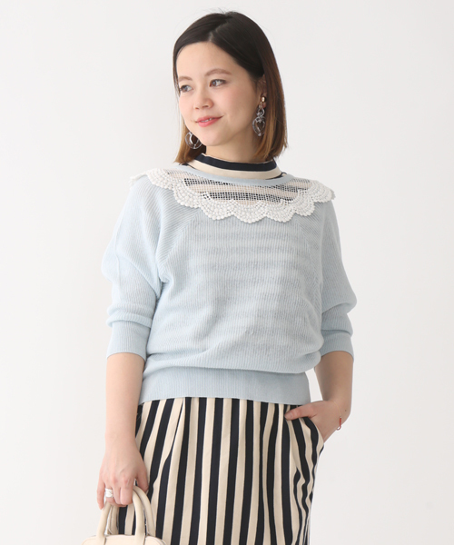 mystic(ミスティック) クロッシュレースの襟がフェミニンな印象のプルオーバー。女の子らしさをプラスしてくれます。 レース編みの透け感もあるので、インナーの色を変えると雰囲気も変えて頂けます。