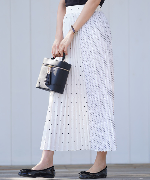 リズミカルなドット切替のロングプリーツスカート 細かいひだが華やかな表情を作るアコーディオンプリーツスカート。 マキシ丈で大人っぽい雰囲気に仕上げました。 大小のドットをアシンメトリーに切り替えてスタイリングにニュアンスをプラス。 歩く度にひらひらと揺れる優雅で女性らしい着こなしが楽しめます。 バレエシューズやパンプスでフェミニンに、スニーカーでカジュアルミックスに、などなど遊び心もくすぐられる1枚♪ 裏地あり 伸縮性なし 薄手 ウエスト後ろゴム仕様 多少のプリントムラ等みられる場合もございます プリーツ加工 (永久的なものではないためお洗濯やご着用を繰り返すたびに消失する場合もございます) 洗濯:洗濯機使用可
